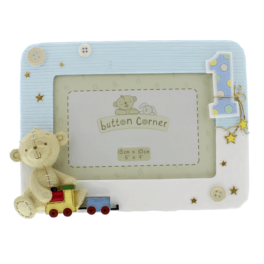 A ceramic photo frame with Button Corner bear holding a train and carriage with a raised number one on the opposite corner finished with buttons dotted around.