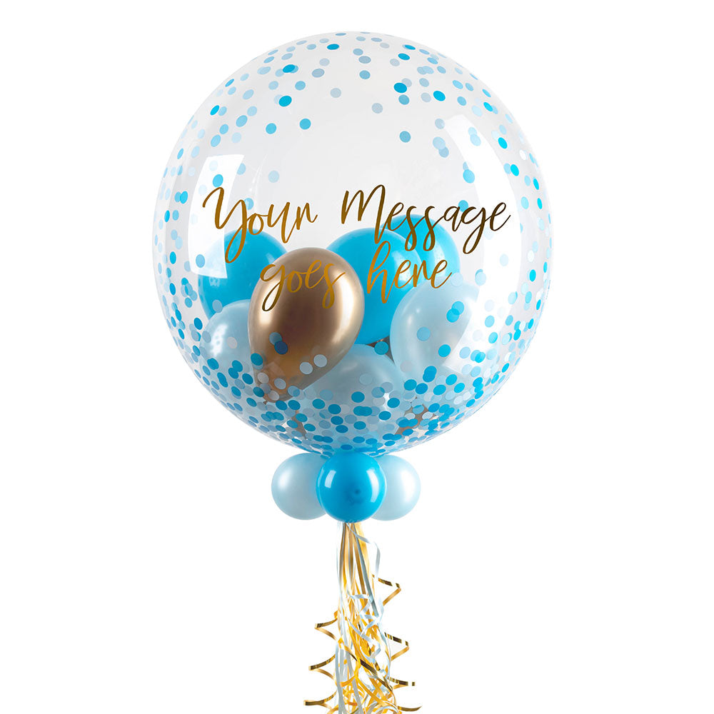 Great for birthdays, baby showers, anniversaries and other special occasions. This beautiful 24-inch balloon comes with a blue confetti print design and is filled with mini balloons in a combination of blue and gold colours. Customise with a message of your choice using our easy online editor.